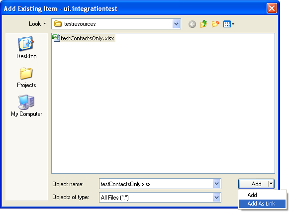 - Add your file to your solution/project (I like to create a solution folder, add the file there, and then link to this file in my project, again under a testresources folder or such*)