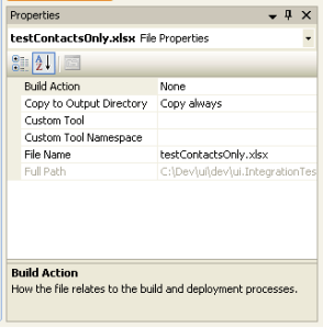 - On the properties for this file keep the build action as “None” and Copy to Output Directory to “Copy Always”