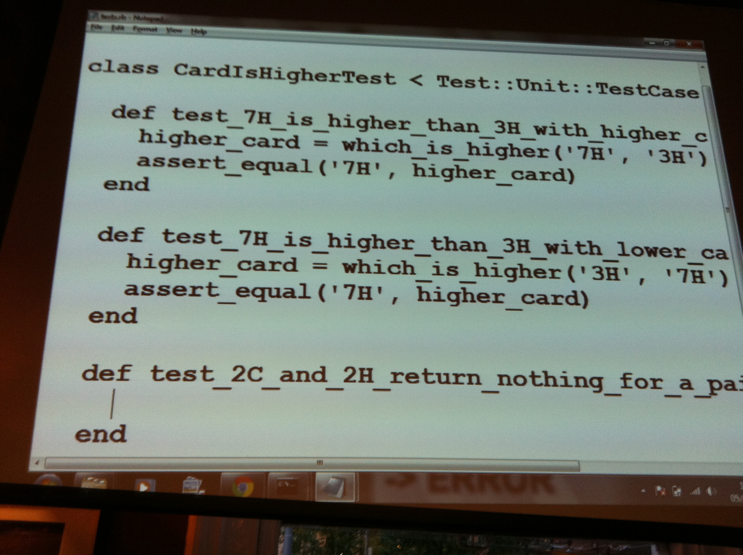 The first 30 minutes or so was spent learning how to do TDD in Ruby. It was pretty difficult, however having 12 people all learning and helping eachother was a really rewarding experience. We all learned, we all felt a sense of achievement when the code compiled. There were whoops and cheers when we made a failing test PASS!