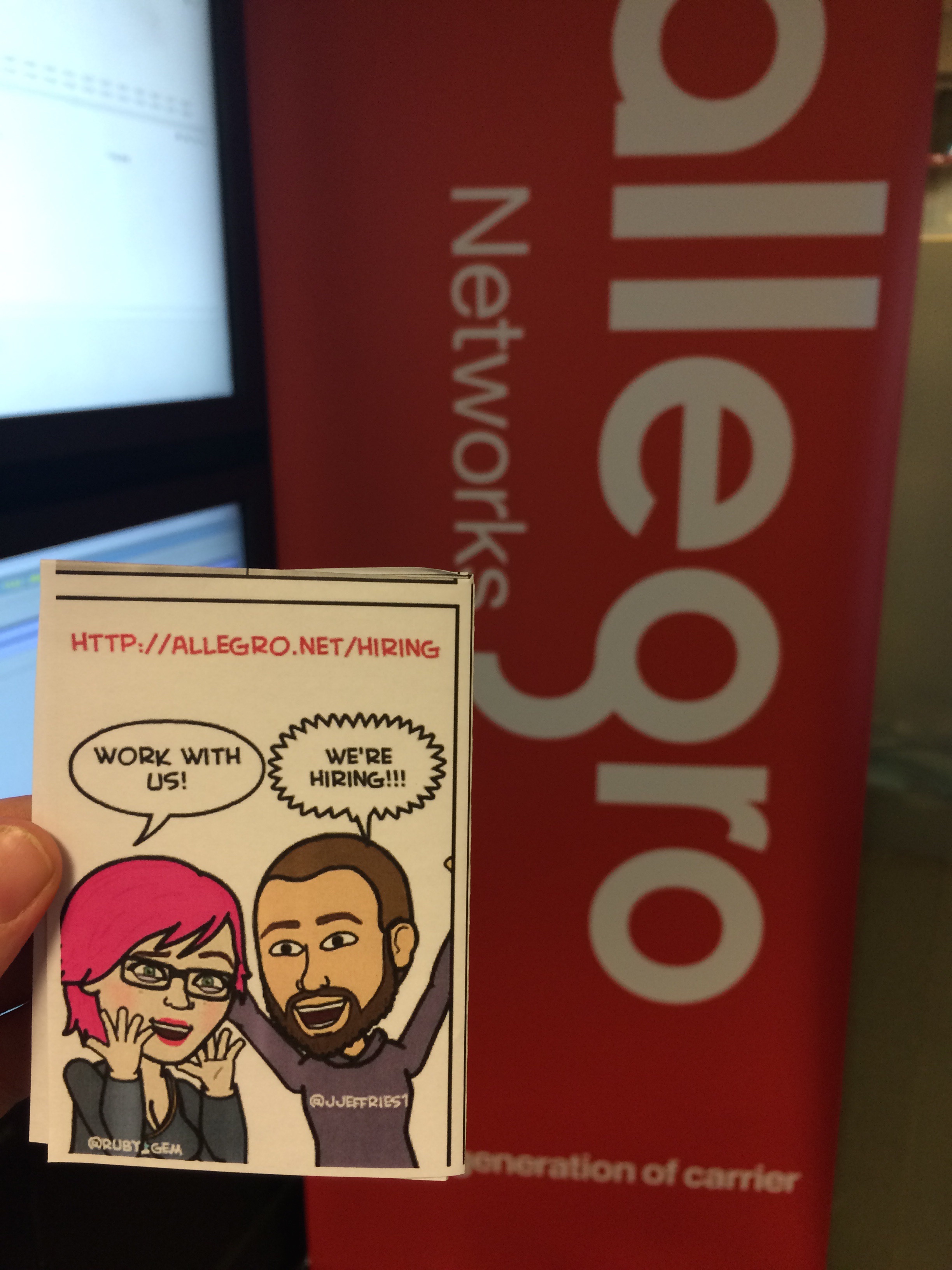 A few days before the event, the organiser contact myself and fellow panelists to invite us to bring marketing or promotional materials along. This stumped myself and the other Allegro dev @jjeffries. Our marketing expert had only left the company a week or two earlier. All we had to hand were business cards, but they’re a bit boring to leave out on a table next to sushi and beer.