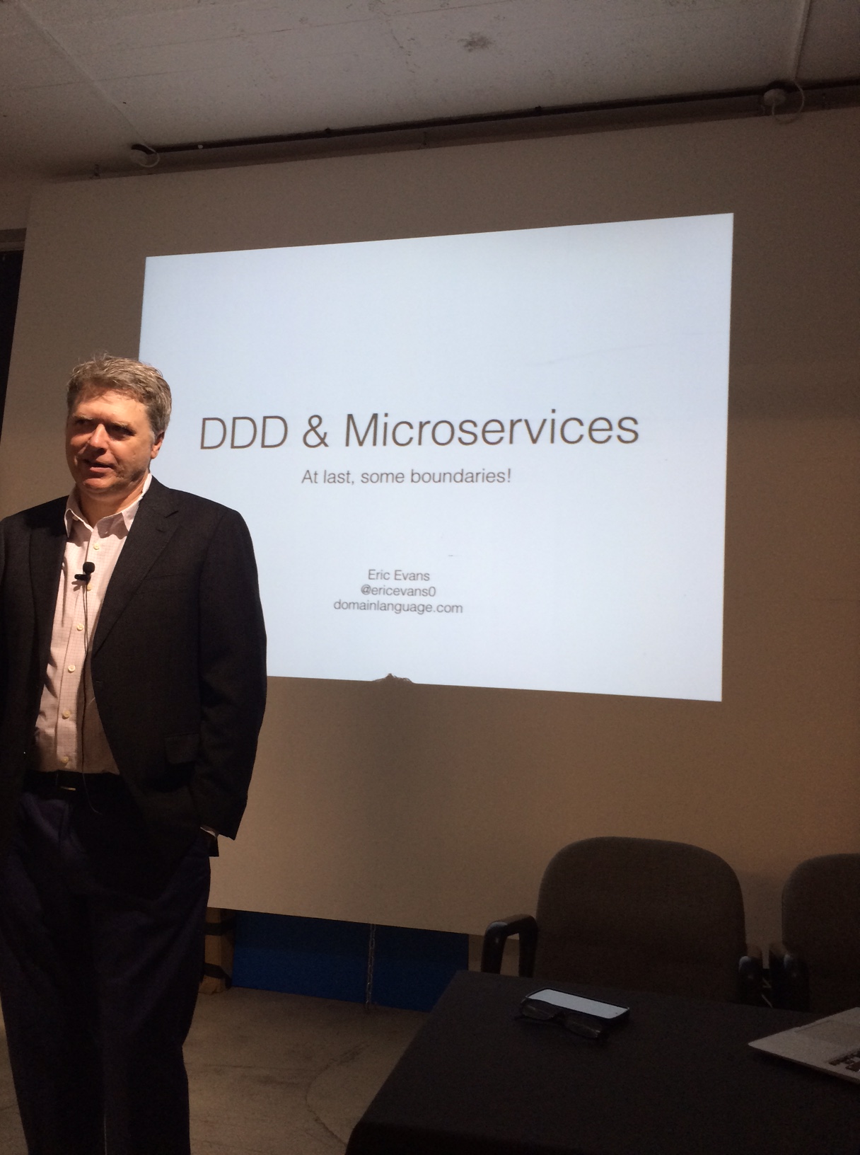 Firstly Eric began explaining how microservices talk to each other by using Context Maps. He described a microservice as a part of the system run by an autonomous team, with boundaries between each one. Messages are sent between the services in the language of each context. Eric then went on to explain all the different ways the language could be sent between each of the microservices.